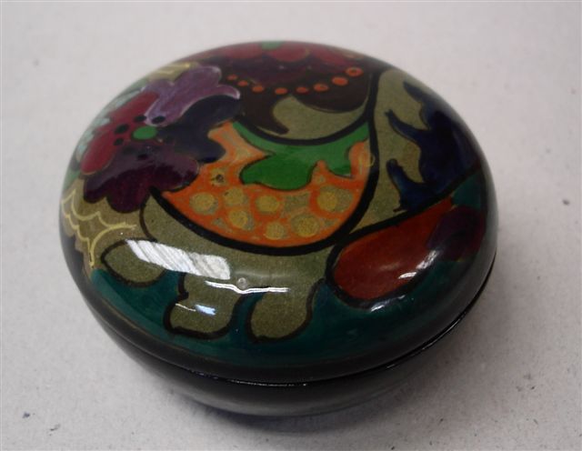 PILLULIER de forme arrondie en faïence. Décor de fleurs stylisées polychromes sur fond noir et bleu foncé.