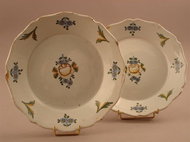 Paire d'ASSIETTES de forme chantournée. Ailes à décor de fleurettes et de branches, bassins centrés d'une rose flanquées de fleurettes.