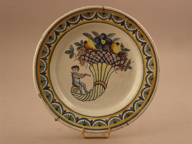 ASSIETTE en faïence. Décor de grand feu dans le bassin d'un putto jouant de la flûte, assis à l'extrémité d'une corne d'abondance. Le marli est orné d'une frise de végétaux stylisés.