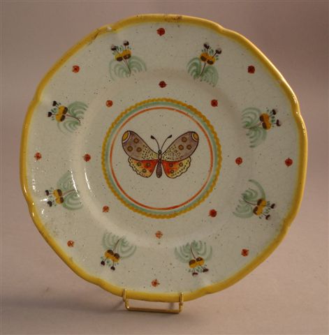 ASSIETTE en faïence de grand feu à décor d'un papillon dans le bassin et de végétaux sur l'aile. Porte au revers la mention "Montagnon" et la signature GM.