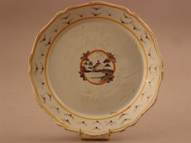 ASSIETTE en céramique. Décor de grand feu dans le bassin d'une bâtisse dans un cartouche polylobé. Aile chantournée, à double filet et motif stylisé.