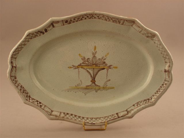 Un PLAT cul noir en faïence de grand feu. Bassin orné d'une coupe garnie de fleurs. Marli chantourné, orné d'une frise de croisillons.