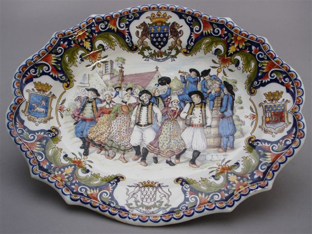 PLAT ovale à bord contourné, à décor polychrome d'une scène de fête villageoise bretonne. L'aile richement ornée d'une composition florale alternée de quatre blasons armoriés et des inscriptions "Mont-Saint-Michel" et "A ma vie".