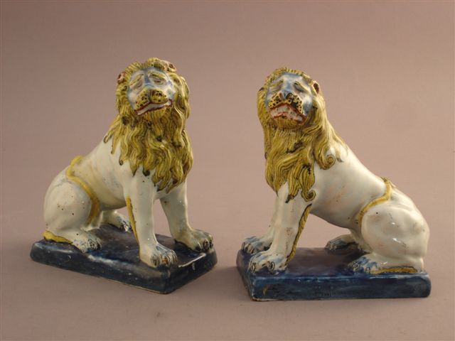 PAIRE DE LIONS assis en faïence polychrome.