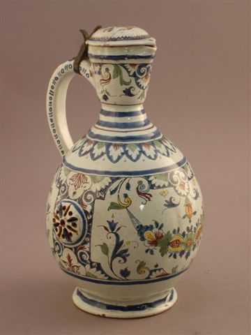 PICHET "trompeur" ou "à surprise" en faïence. Décor polychrome de guirlandes de fleurs et de rinceaux. La panse présente deux mascarons ajourés à motifs rayonnants.