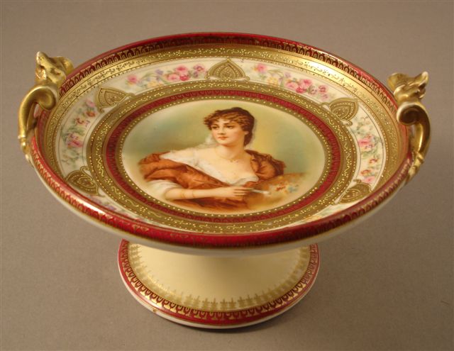 Coupe en porcelaine sur piédouche, elle est ornée en son centre d'un portrait de femme artiste.