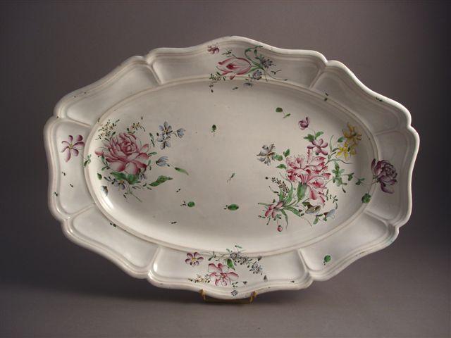 Grand PLAT oblong à bord contourné "façon argent" à décor au petit feu polychrome de fleurs chatironnées. Marque en bleu sous la couverte HANNONG Joseph et numéro de forme 113.
