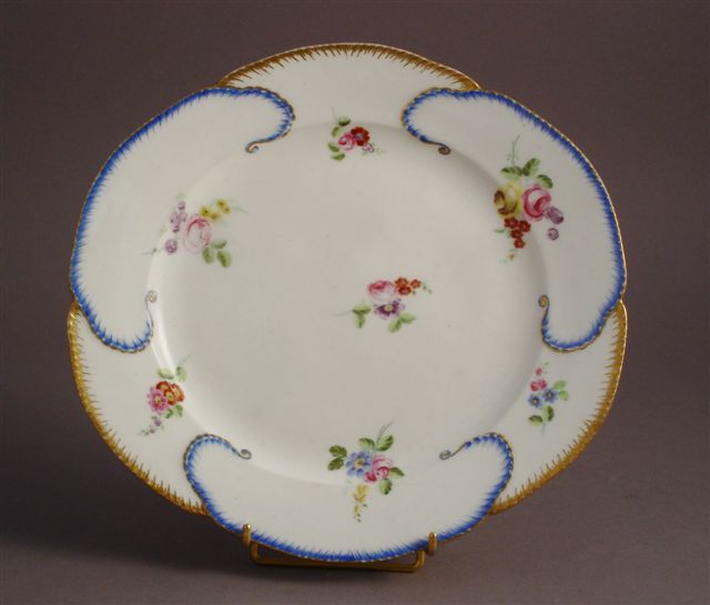 Porcelaine, ASSIETTE polylobée, "à feuilles de choux", portant la marque de Sèvres avec la lettre date "F" surmontée de la marque du peintre ornemaniste "S". Le marli est constitué de six lobes dont les contours sont alternativement ornés de peignets de bleu et d'or. L'ensemble de l'assiette est parsemé de petits bouquets de fleurs fines.