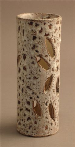 LAMPE de forme cylindrique en faïence, émail pulvérulent grisâtre, décor ajouré de fleurs.