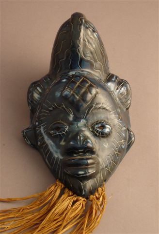 MASQUE en faïence émaillée bleu et noir sur fond blanc. Il est agrémenté d'une longue barbe de raphia.