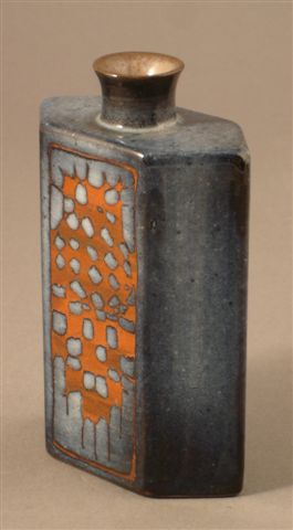 BOUTEILLE hexagonale en céramique émaillée bleu, créant en réserve un décor géométrique couleur ocre.