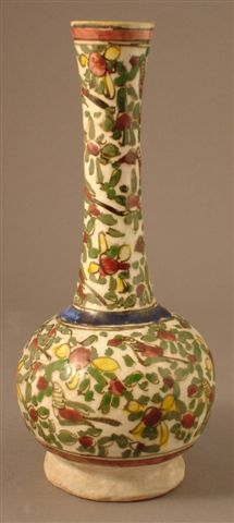 VASE à long col en terre vernissée à décor de grand feu d'oiseaux dans des feuillages dans le goût perse.