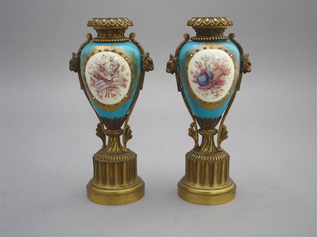 Paire de VASES en porcelaine ornés de trophées de musique et de jeunes femmes à l'antique avec amours, dans des réserves sur fond bleu. La porcelaine est incrustée de petites pierres de couleur. Monture en bronze à décor de protomés, godrons, feuilles d'eau, rang de perles et cannelures torses. Le socle en forme de colonne tronquée à cannelures.