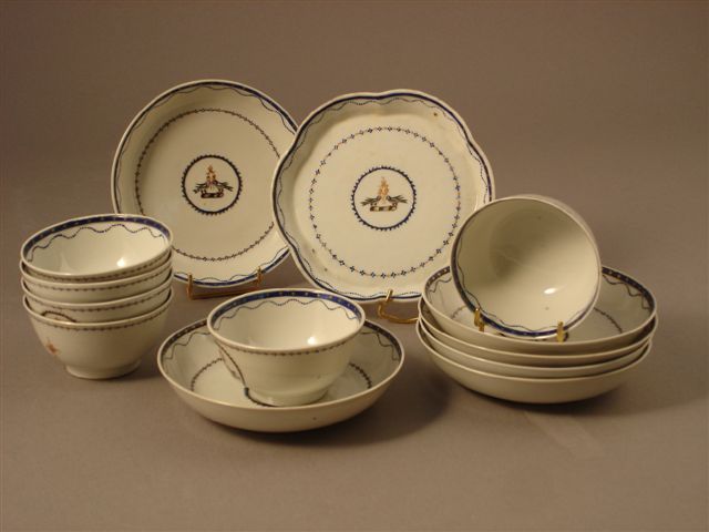 COMPAGNIE des INDES. 6 tasses-bols et 6 sous tasses, joint 1 petite assiette à bords ondés. Bordure à filets ondés et pastillés d'étoiles or à l'intérieur. Médaillon aux oiseaux au branchage. Camaïeu de bleu et or. XVIIIème. (fêles)