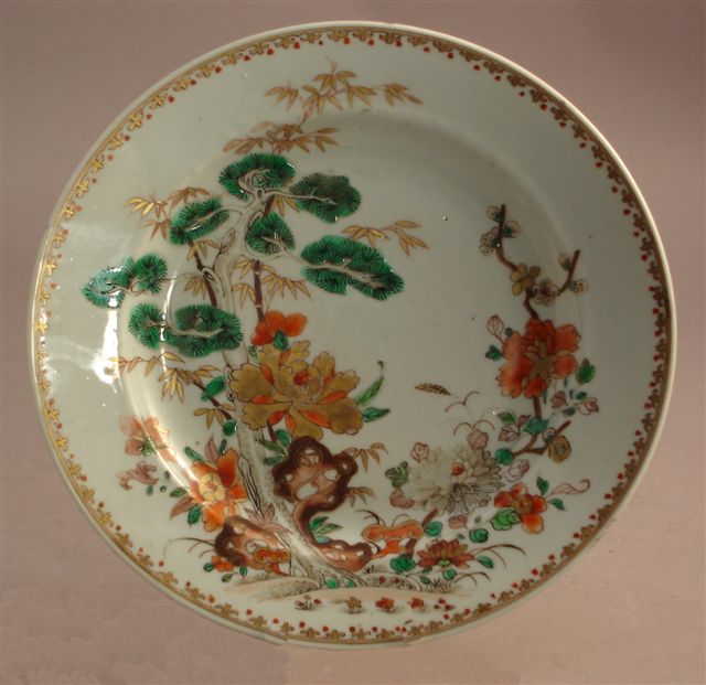 ASSIETTE en porcelaine du japon à décor de branchanges fleuris, prunus, bambous et conifères.