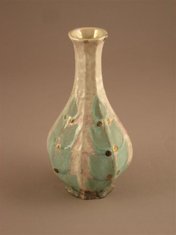 VASE hexagonal en céramique à couverte verte formant des feuillages sur fond blanc.