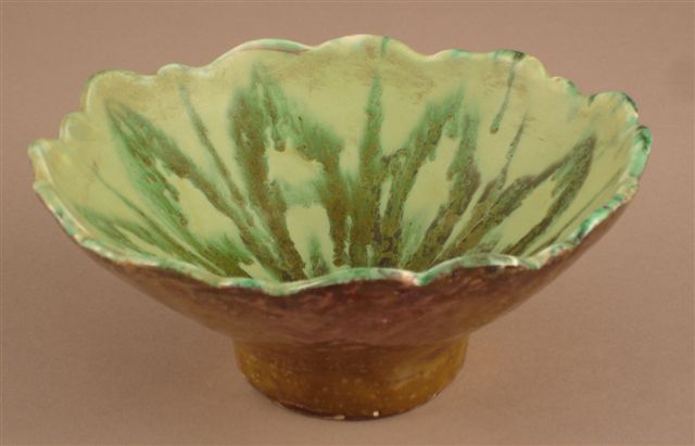 COUPE en céramique. Couverte verte dans le bassin, aile chantournée.