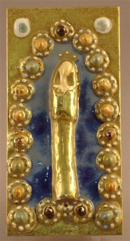 PLAQUE en céramique figurant la vierge dans un entourage de médaillons en relief.