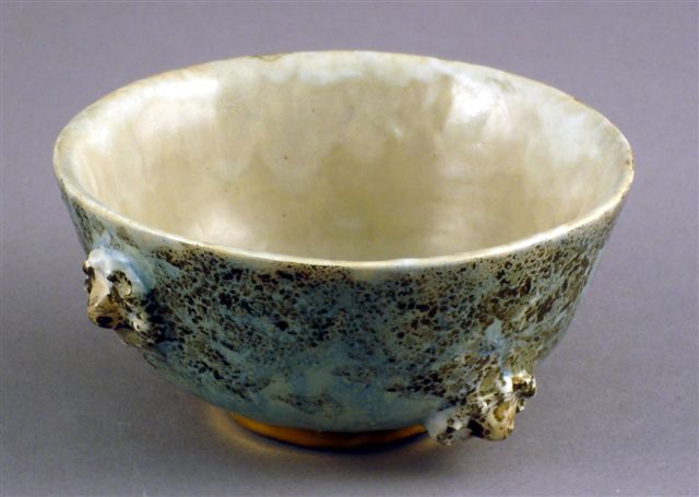 COUPE en céramique. Ornée de médaillons à l'extérieur, d'une couverte nacrée à l'intérieur. Signée au revers.