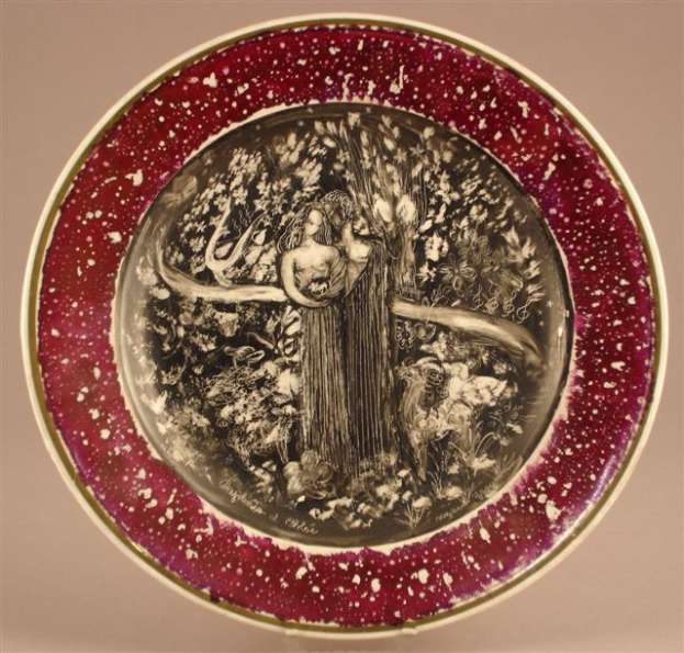 ASSIETTE en céramique. Représentation dans le bassin de Daphnis et Chloé sous un arbre, entourés d'animaux. Signée et titrée dans le bassin en bas à droite.