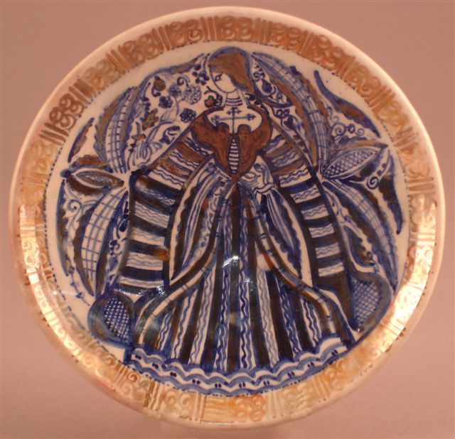 "D'après l'Espagne", COUPE en céramique. Décor d'un personnage féminin les bras ouverts dans le bassin. Aile ornée d'une frise géométrique métallique.