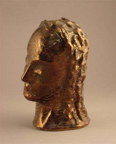 Tête songeuse. SCULPTURE en céramique à couverte métallique brune craquelée.