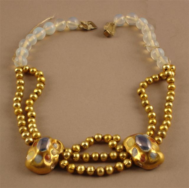 COLLIER en perles de verre et de céramique dorée comprenant deux médaillons en céramique polychrome.