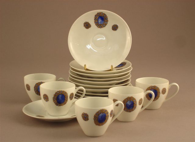 Ensemble de DOUZE TASSES et de ONZE SOUCOUPES en porcelaine. Décorées de médaillons bleus sertis de perles. Les tasses sont signées au revers.