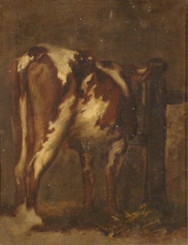 École EUROPÉÈNNE du XIXème.Vache à l'étable.Huile sur toile.30 x 22...