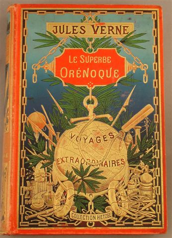 Percaline rouge. Plat sup. sur fond bleu, à la mappemonde et aux instruments. (Engel). ill. de G. ROUX. Catalogue AJ.