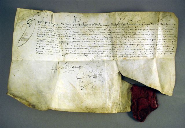 HENRI IV (1553-1610). P.S., contresignée par Potier, Paris 8 août 1606 ; vélin obl. in-fol. (un peu sali), important fragment de sceau cire rouge à l'effigie du Roi à cheval et aux armes royales.