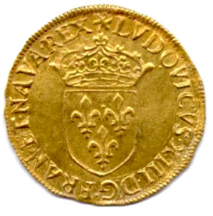 Écu de France couronné. Soleil initial. Point 4e. R/. Croix aux bras torsadés et fleurdelisés. Croisette initiale. Lettre d'atelier en coeur. Point 4e. Etoile et millésime en fin de légende.