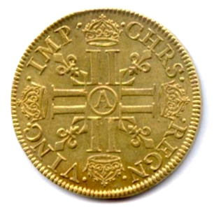 Tête virile et laurée du roi à droite, la mèche courte. Couronne de laurier sans baie. Dessous, date entre deux points. R/. Croix formée de huit L couronnés cantonnée de quatre lis. Au centre, lettre d'atelier.