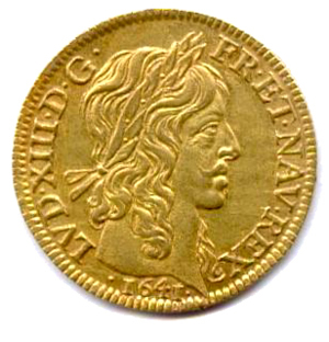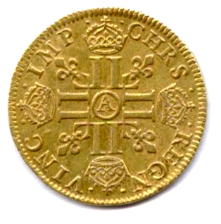 Tête virile et laurée du roi à droite, la mèche longue. Couronne de laurier avec baie. Dessous, date entre deux points. R/. Croix formée de huit L couronnés cantonnée de quatre lis. Au centre, lettre d'atelier.