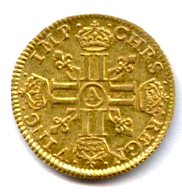 Tête virile et laurée du roi à droite, la mèche longue. Couronne de laurier sans baie. Dessous, date entre deux points. R/. Croix formée de huit L couronnés cantonnée de quatre lis. Au centre, lettre d'atelier.
