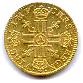 Tête virile et laurée du roi à droite, la mèche longue. Couronne de laurier sans baie. Dessous, date entre deux points. R/. Croix formée de huit L couronnés cantonnée de quatre lis. Au centre, lettre d'atelier.