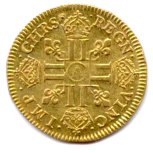 Tête laurée du roi enfant, avec la mèche courte. Dessous, millésime. Couronne de laurier avec baies. R/. Croix formée de huit L couronnés cantonnée de quatre lis. Au centre, lettre d'atelier. Légende commençant à 9h. Petite croix sous le point après CHRS.