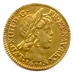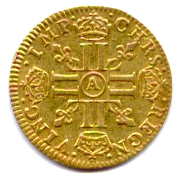 Tête laurée du roi enfant, avec la mèche courte. Dessous, millésime. Couronne de laurier avec baies. R/. Croix formée de huit L couronnés cantonnée de quatre lis. Au centre, lettre d'atelier. Légende commençant à 12h.