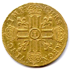 Tête laurée du roi enfant, avec la mèche longue. Dessous, millésime entre un cœur et un losange. Couronne de laurier avec baies. R/. Croix formée de huit L couronnés cantonnée de quatre lis. Au centre, lettre d'atelier. Légende commençant à 12h.