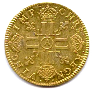 Tête laurée du roi enfant, avec la mèche longue. Dessous, millésime entre deux points. Au-dessus de la tête, cur. Point sous le 4e I de XIIII. Couronne de laurier sans baies. R/. Croix formée de huit L couronnés cantonnée de quatre lis. Au centre, lettre d'atelier. Légende commençant à 12h. Triangle sous le R de CHRS.