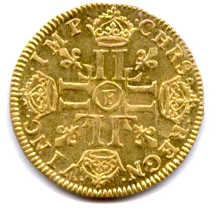 Tête laurée du roi enfant, avec la mèche longue. Trèfle en début de légende. Millésime sous la tranche du cou. Sans baies. R/. Croix formée de huit L couronnés cantonnée de quatre lis. Au centre, lettre d'atelier. Légende commençant à 12h.