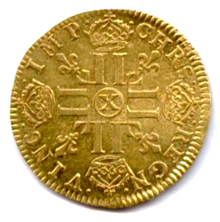 Tête laurée du roi enfant, avec la mèche longue. Dessous, millésime entre deux points. Clochette au-dessus de la tête. Avec baies. R/. Croix formée de huit L couronnés cantonnée de quatre lis. Au centre, lettre d'atelier.