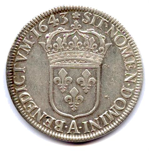 Écu d'argent à la mèche courte, 1643. 27,34g. A = Paris. Très beau.