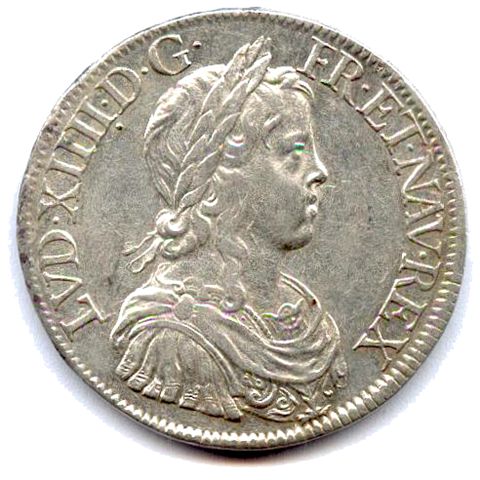 Buste lauré, drapé et cuirassé du roi enfant, avec la mèche longue. Couronne de laurier sans baies. Point après G. Point sous le 4e I de XIIII. R/. Écu de France couronné. Lettre d'atelier à la pointe de l'écu et millésime en fin de légende. Fleur à huit pétales en début de légende.