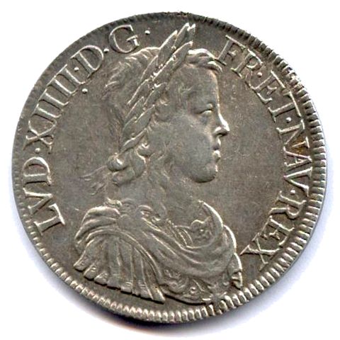 Buste lauré, drapé et cuirassé du roi enfant, avec la mèche longue. Couronne de laurier sans baies. Point après G. Point sous le 4e I de XIIII. R/. Écu de France couronné. Lettre d'atelier à la pointe de l'écu et millésime en fin de légende. Fleur à huit pétales en début de légende.