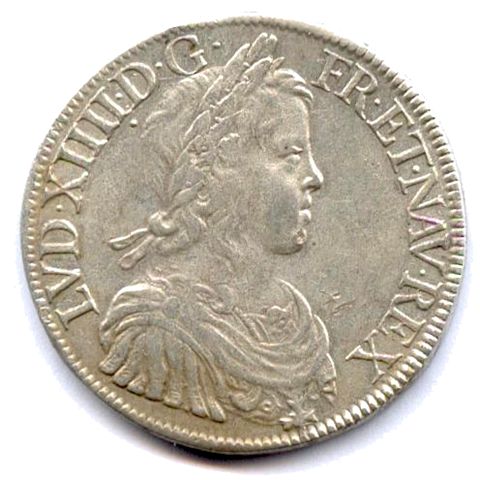 Buste lauré, drapé et cuirassé du roi enfant, avec la mèche longue. Couronne de laurier sans baies. Point après G. Point sous le 4e I de XIIII. R/. Écu de France couronné. Lettre d'atelier à la pointe de l'écu et millésime en fin de légende. Fleur à huit pétales en début de légende.