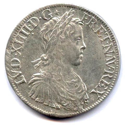 Buste lauré, drapé et cuirassé du roi enfant, avec la mèche longue. Couronne de laurier sans baies. Etoile en remplacement du point après G. Point sous le 4e I de XIIII. R/. Écu de France couronné. Lettre d'atelier à la pointe de l'écu et millésime en fin de légende. Fleur à huit pétales en début de légende. Triangle sou le O de DOMINI.
