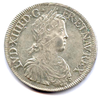 Buste lauré, drapé et cuirassé du roi enfant, avec la mèche longue. Couronne de laurier sans baies. Etoile en remplacement du point après G. Point sous le 4e I de XIIII. R/. Écu de France couronné. Lettre d'atelier à la pointe de l'écu et millésime en fin de légende. Fleur à huit pétales en début de légende. Triangle sou le O de DOMINI.