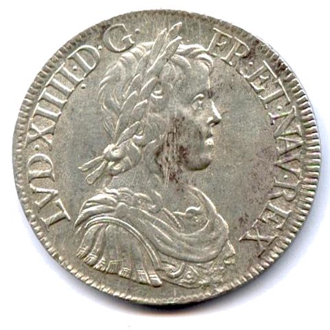 Buste lauré, drapé et cuirassé du roi enfant, avec la mèche longue. Couronne de laurier sans baies. Point après G. Point sous le 4e I de XIIII. R/. Écu de France couronné. Lettre d'atelier à la pointe de l'écu et millésime en fin de légende. Fleur à huit pétales en début de légende. Triangle sou le O de DOMINI.