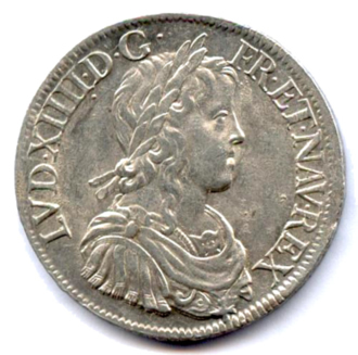 Buste lauré, drapé et cuirassé du roi enfant, avec la mèche longue. Couronne de laurier sans baies. Point après G. Point sous le 4e I de XIIII. R/. Écu de France couronné. Lettre d'atelier à la pointe de l'écu et millésime en fin de légende. Fleur à huit pétales en début de légende. Triangle sou le O de DOMINI.